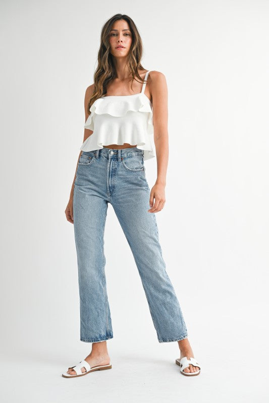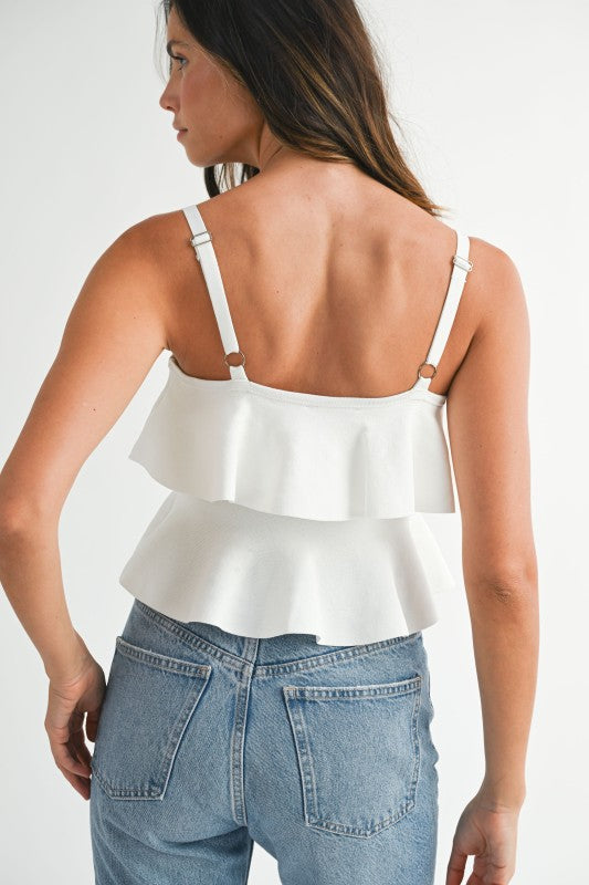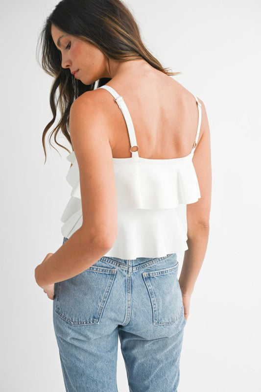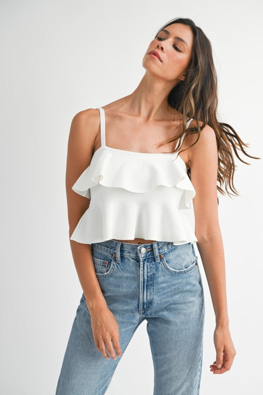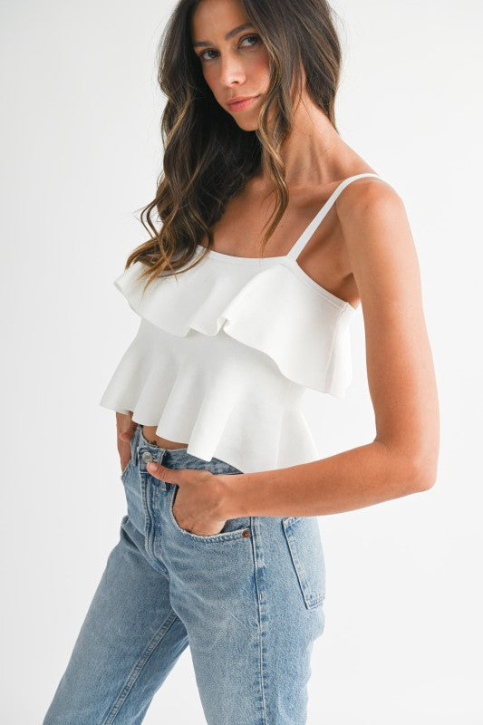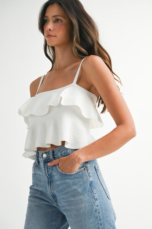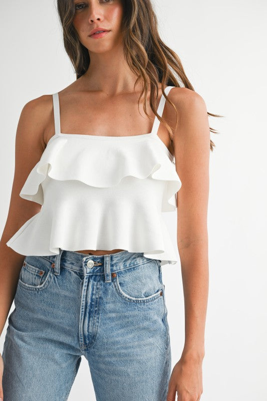 Adjustable strap cropped ruffle tank.