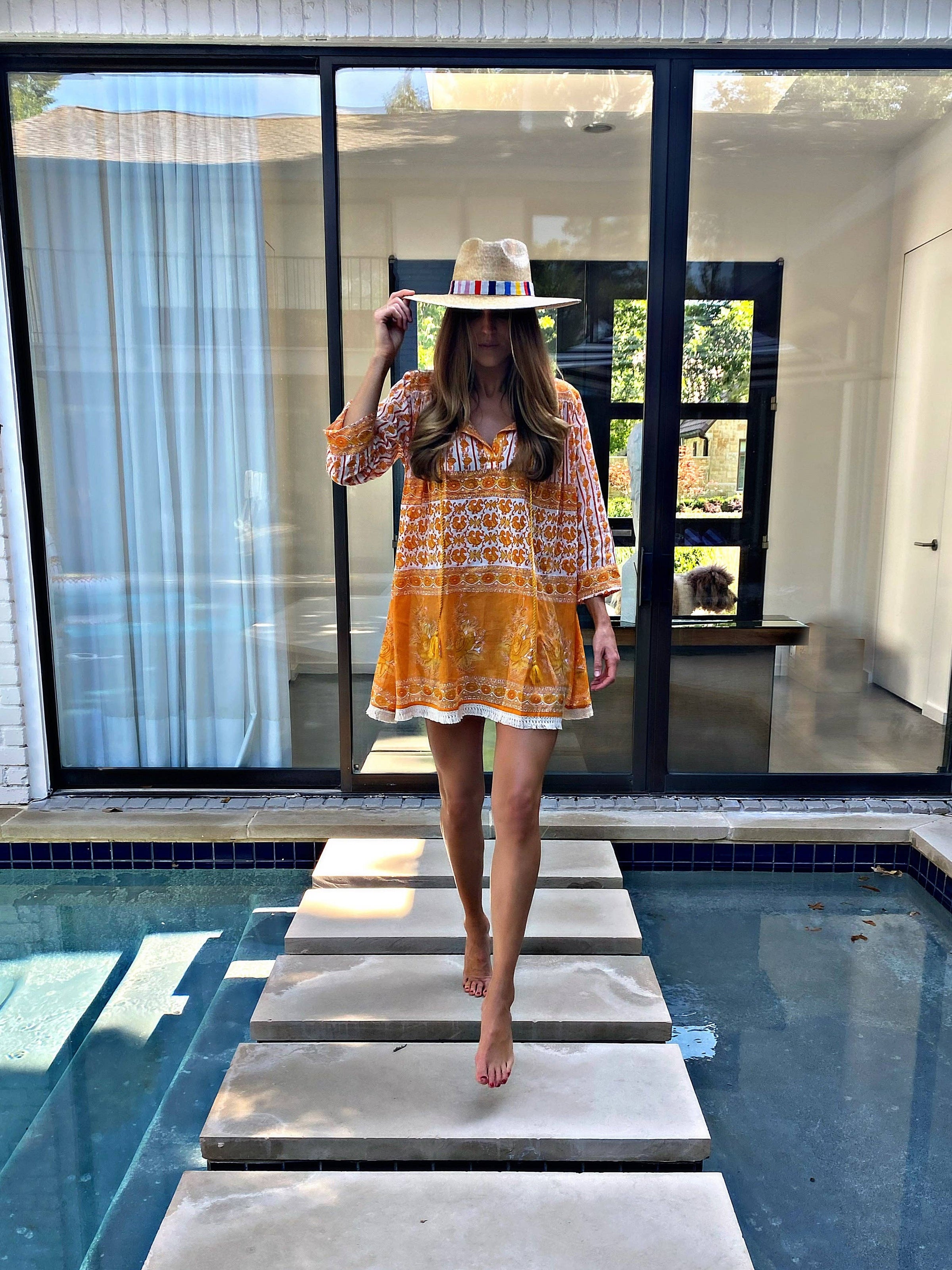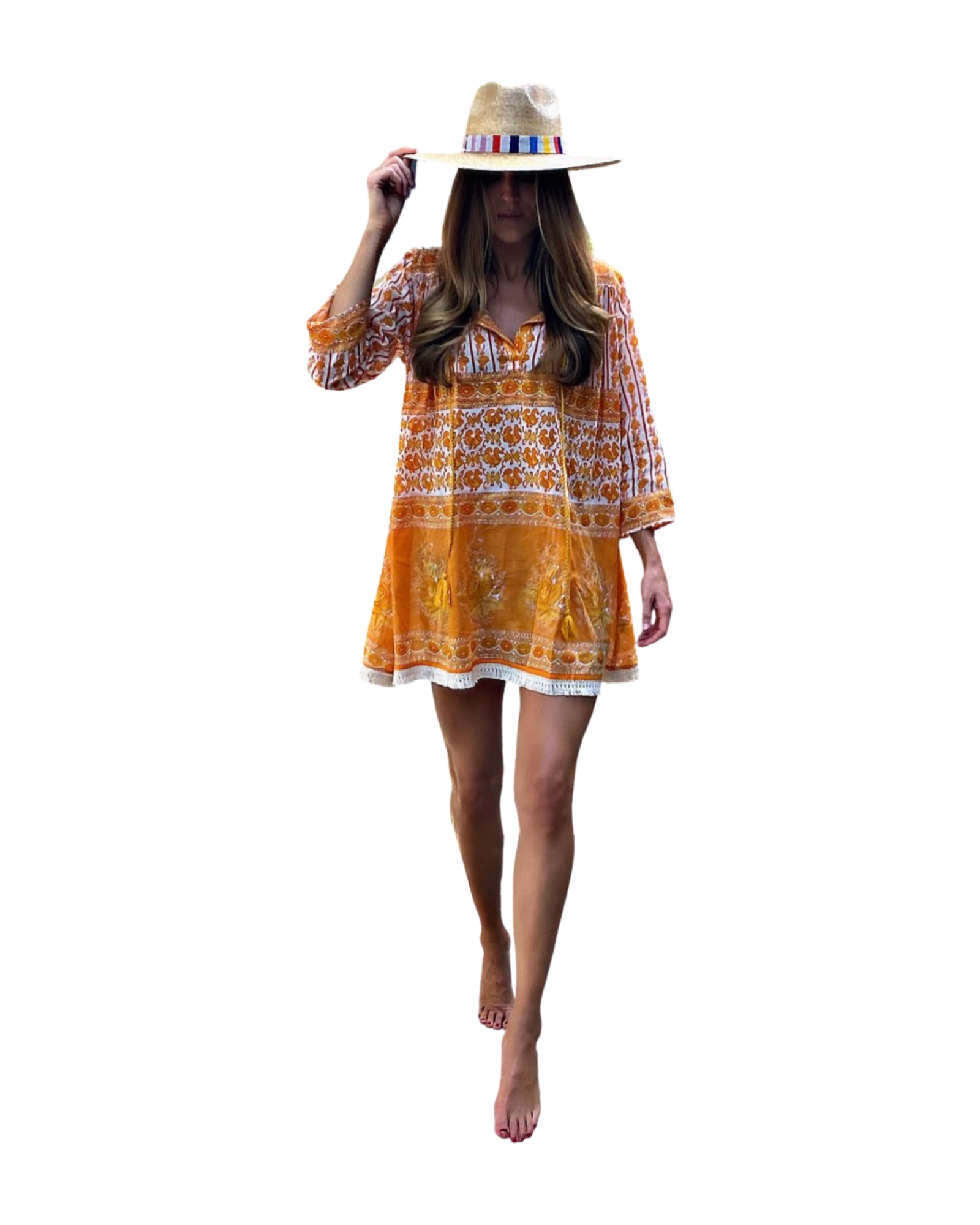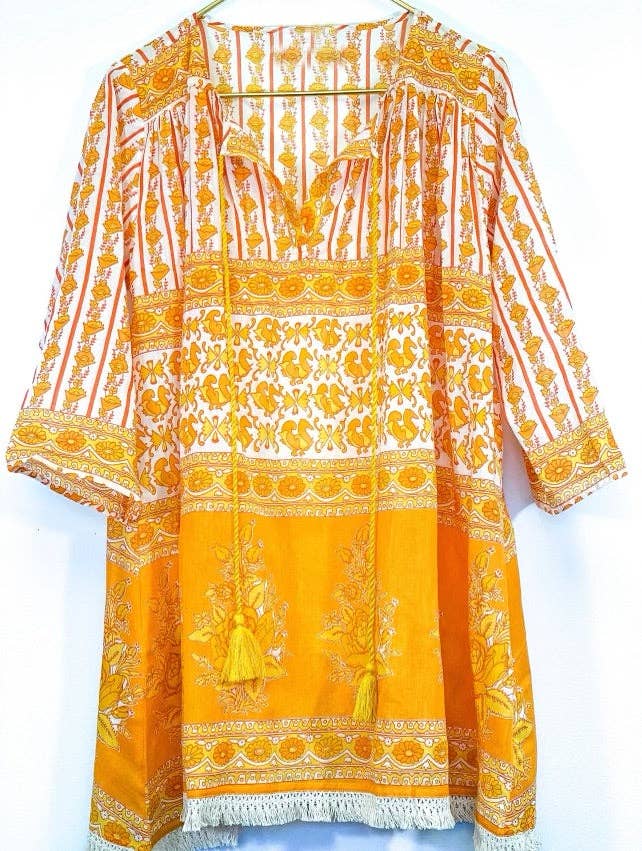 Our lightweight tunic is simple and fun with tassel ties on the v-neckline and fringe detail along the hem. Made from 100% cotton, the length falls above the knee. Wear alone or pair with your favorite denim! With its colorful print, this tunic is easily the most versatile piece to complete your summer look!
