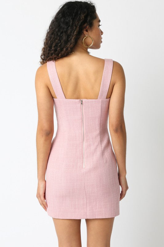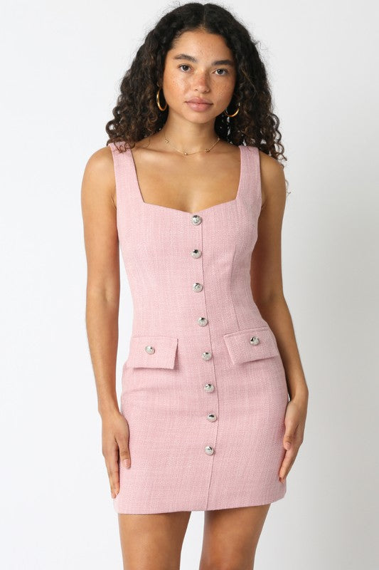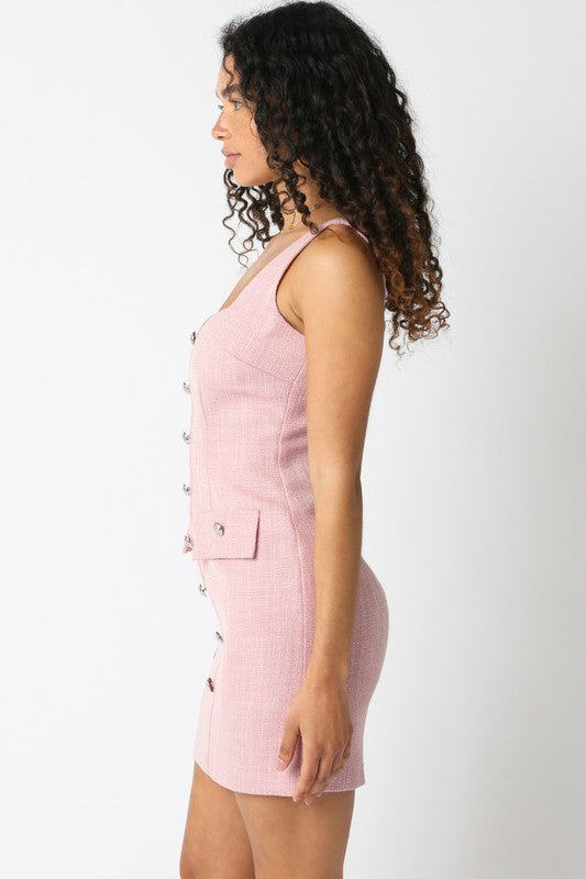 Pink button down mini dress.