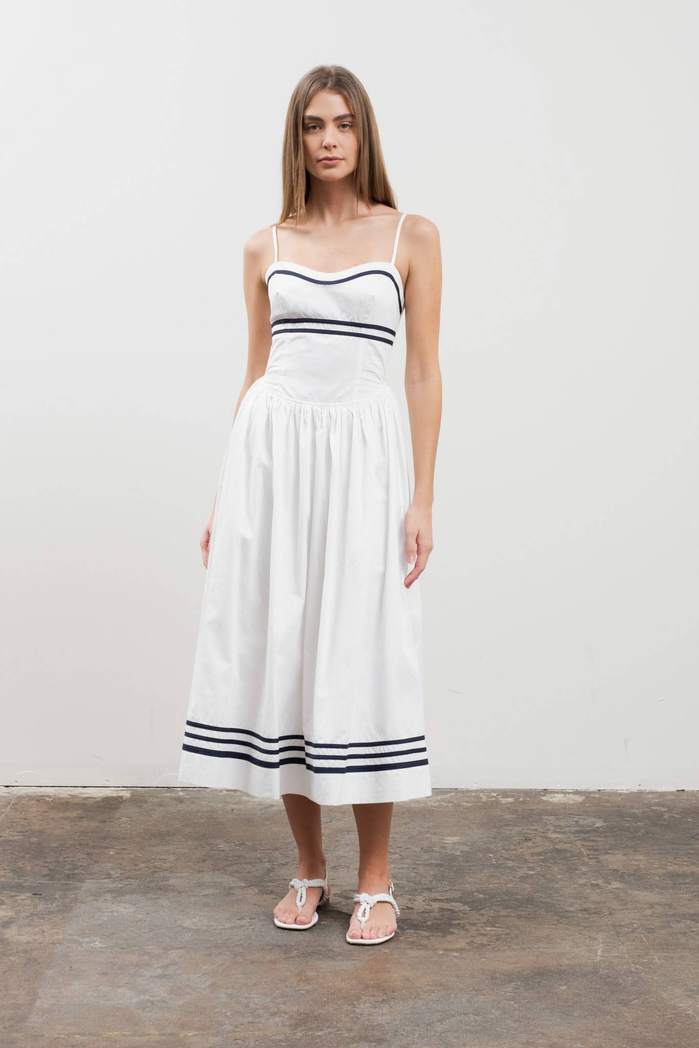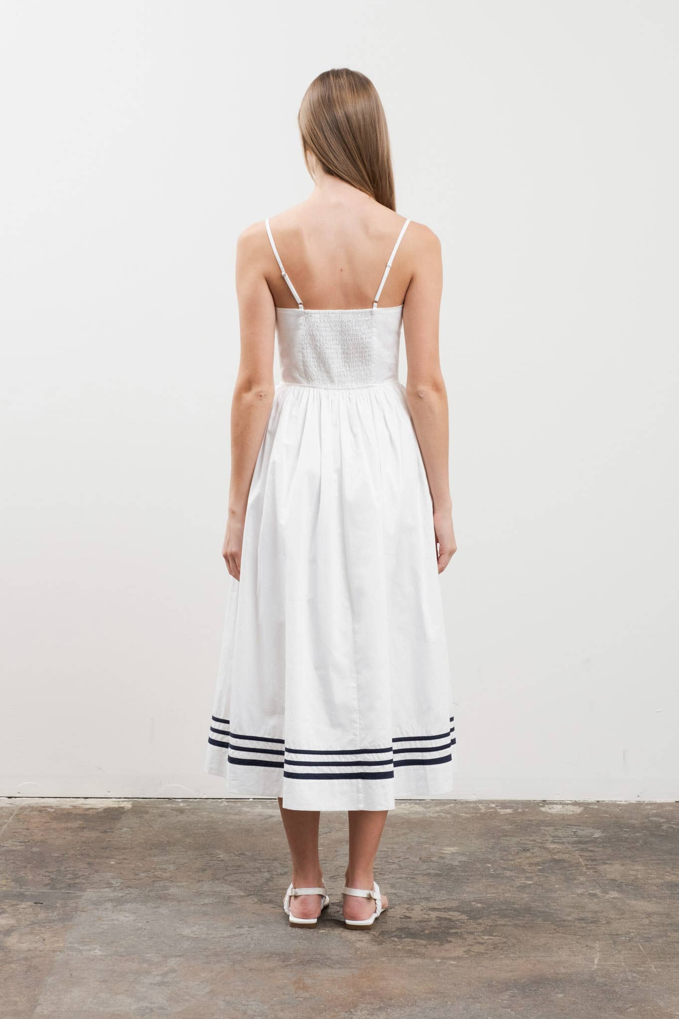 SWEETHEART NECKLINE SWEETHEART NECKLINE SLEEVELESS ADJUSTABLE SPAGHETTI STRAP BACK SMOCKING A-LINE MIDI DRESS LINED SHELL:100%COTTON CONTRAST:100%COTTON LINING:100%POLYESTER