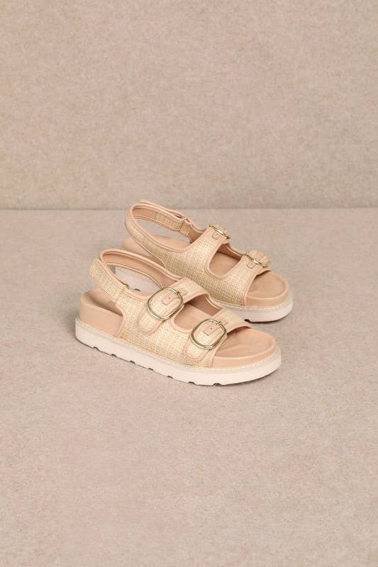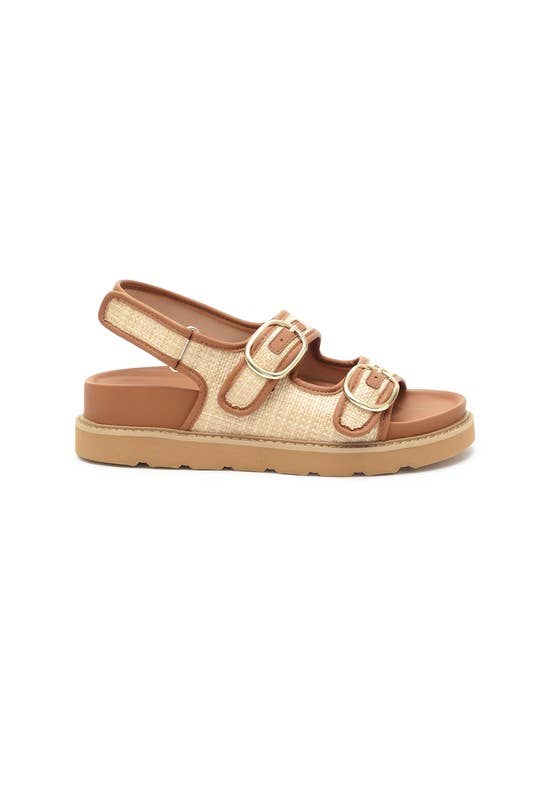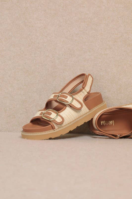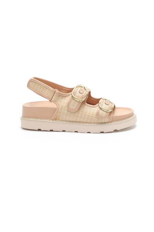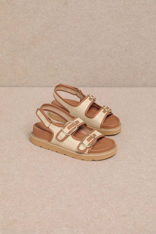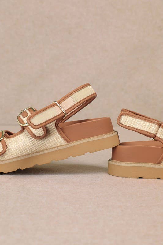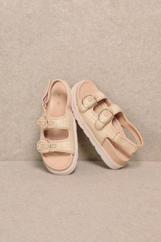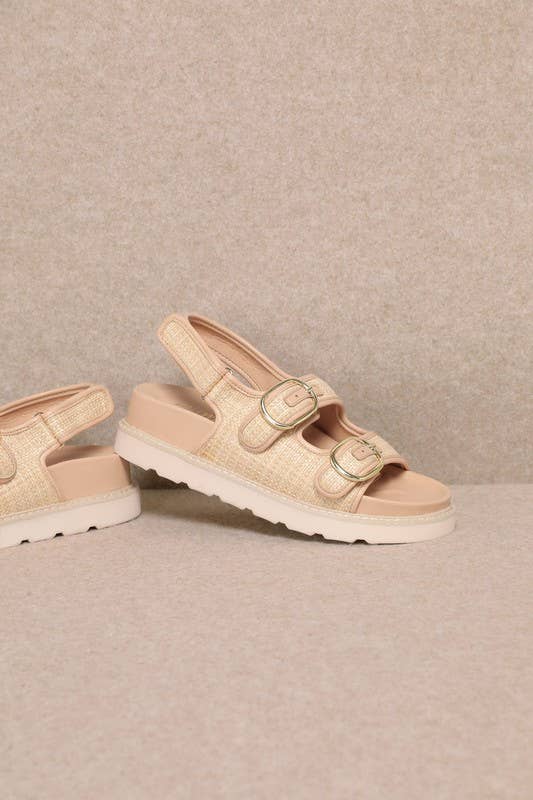 Discover the perfect blend of comfort and style with the HALLIE - Dual-Buckle Straw Effect Sandals. These low slip-on sandals feature utilitarian-style straps with chic metal buckles, showcasing statement-making colorways and textures. Crafted from lightweight leather with a straw-effect finish and a mixed colors leather upper, these sandals offer a casual yet vogue appearance. Complete with a contoured footbed for added comfort, they are ideal for pairing with dresses or shorts, making them a versatile choice for any summer ensemble.