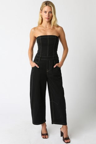 Strapless denim jumpsuit with contrast stitching. Barrel jean. Side zipper.